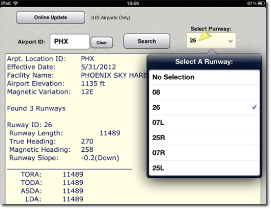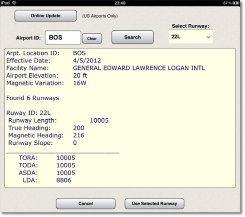 From the "Select Runway" option select the runway you would like to use and tap the "Use Selected Runway" to accept the choice.